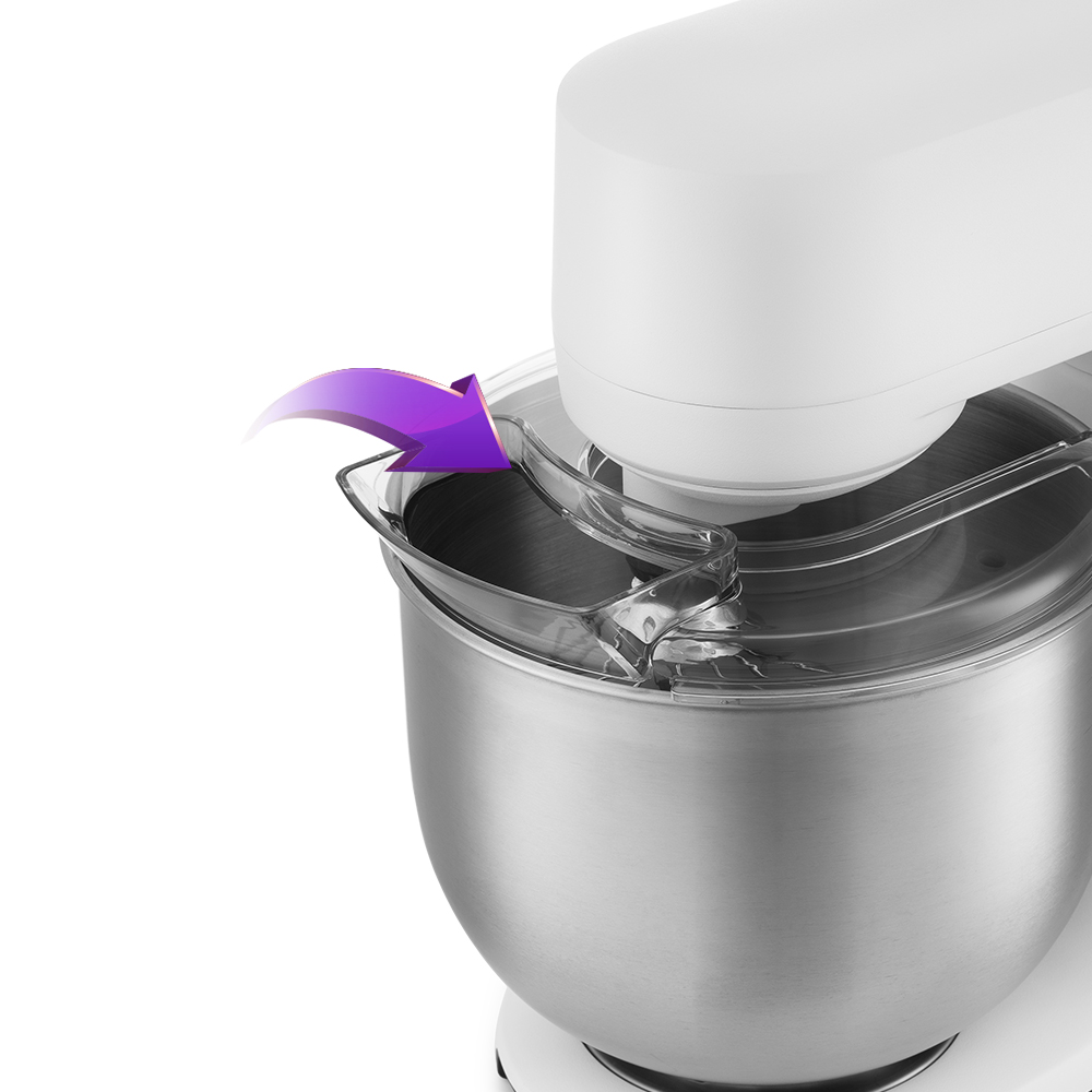 Чаша ёмкостью 5 л изготовлена из нержавеющей стали, она прочная и в ней можно смешивать даже горячие ингредиенты. Она укомплектована защитной крышкой с загрузочным отверстием, через которое можно добавлять ингредиенты прямо во время работы.