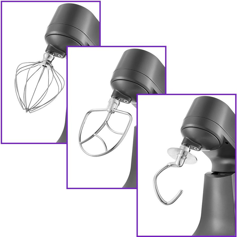 В комплекте идут венчик для взбивания, крюк для замеса крутого теста, насадка для смешивания и приготовления пюре. Форма насадок и чаши подобраны так, что почти при любом количестве продуктов насадка качественно их перемешает.