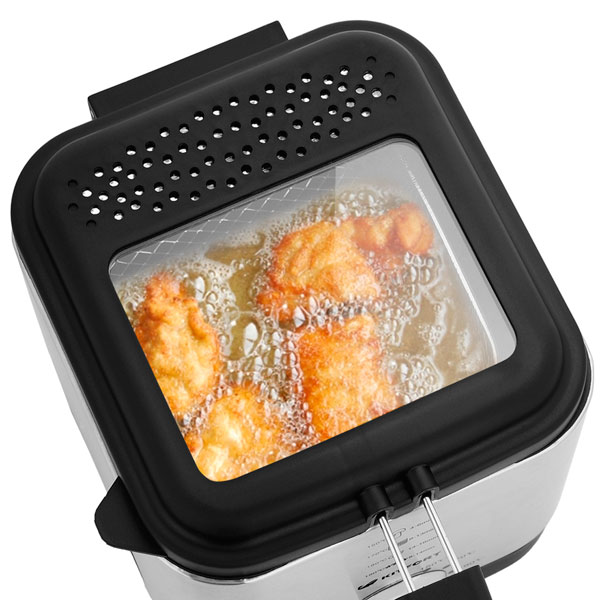 Объём резервуара для масла – 1,5 литра. Особое покрытие чаши не позволит частичкам пищи пригореть, нагревательный элемент скрыт. Это заметно упростит очистку фритюрницы. Встроенный в крышку фильтр не даст запахам готовящихся блюд распространиться по всему помещению. Корзина съёмная, снабжена удобной ручкой, которая не нагревается в процессе жарки. За устойчивость устройства отвечают прорезиненные ножки, они надёжно фиксируют его на столе.