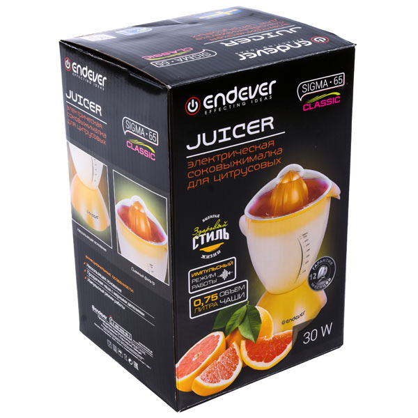 Электрическая соковыжималка для цитрусовых Endever Sigma-65 оснащена прочным пластиковым корпусом. Устройство питается от сети с напряжением 220 В.