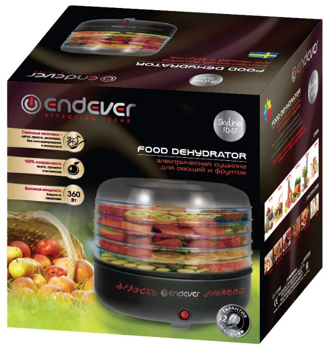 Традиционно сушение продуктов является лучшим способом сохранения витаминов. А в последнее время среди приверженцев правильного питания и настоящих ценителей вкусов природы все большую популярность набирают электрические сушилки. Электросушилка, в отличие от стандартных методов засушивания на открытом воздухе или в духовке, обеспечивает гигиеническую чистоту и первозданность вкуса растительных продуктов. Автоматические электросушилка для фруктов и овощей Endever SkyLine FD-57— это быстрая эффективная сушка продуктов путем естественной дегидратации без добавления консервантов, искусственных ароматизаторов и прочих химических добавок, это 100% сохранность вкуса, аромата и витаминов! Работа прибора основана на естественной циркуляции теплого воздуха, полностью сохраняющей полезные свойства и микроэлементы продуктов Электросушилка Endever позволяют заготавливать не только овощи и фрукты, но также мясо и рыбу, травы, орехи, ягоды и грибы и т.д. Через прозрачные, но тонированные стенки Вы можете наблюдать за процессом приготовления, а солнечные лучи не смогут воздействовать на продукты Встроенная функция автоотключения защитит приборы от перегрева За счет 5-ти съемных секций электрическая сушилка для овощей Endever является одновременно компактной и вместительной, а в модели FD-57 возможна их регулировка по высоте Приготовленные в электросушилке Endever продукты уже не требуют специальных условий хранения, не занимают место на полках холодильника