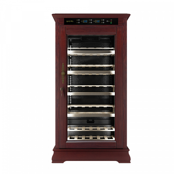 Благодаря специальному алюминиевому покрытию с тиснением внутри корпуса данной модели, достигается оптимальный показатель циркуляции воздуха и равномерного охлаждения содержимого. Для максимального удобства пользователя, производитель установил интуитивно понятную систему управления в верхней части винного шкафа, с помощью которой Вы можете настроить необходимый температурный режим, а также скорректировать показатели уровня влажности.